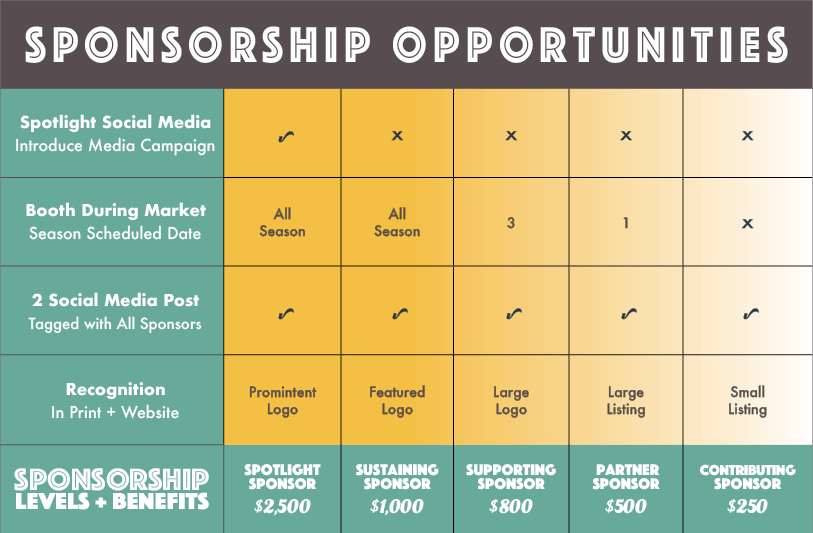 Featured sponsor announcement – spotlight sponsor has the opportunity to introduce a media campaign market details, offerings, vendor spotlights, standalone social media shout out and tagging, prominent logo displayed during market. We invite you to join us for the entire (9 week) market season to promote your business and services that you offer and connect with the local and surrounding community. Your business will also receive one spotlight social media post during the market season.